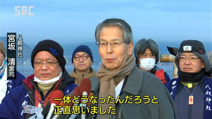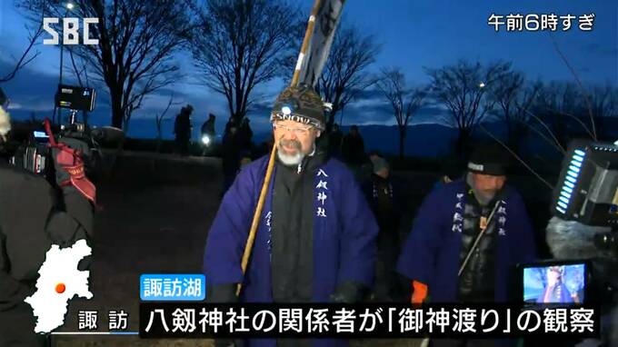 まだ薄暗い朝6時すぎ、諏訪市の諏訪湖畔に集まったのは八剱神社(やつるぎじんじゃ)の関係者。