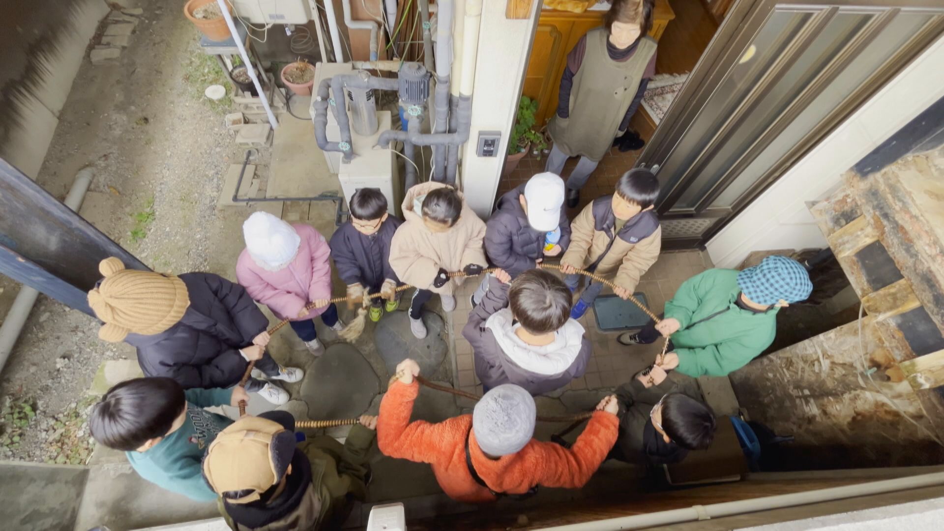 地元の小学1年から5年までの12人が民家を訪ね、住民と輪になって念仏を唱えながら、長い数珠を回しました。