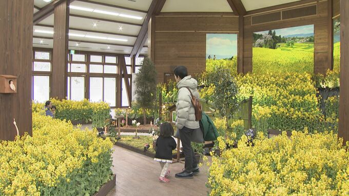安曇野市の国営アルプスあづみの公園では、一足早く春を感じてもらおうと、多目的ホールの中に6000本の菜の花を咲かせています。