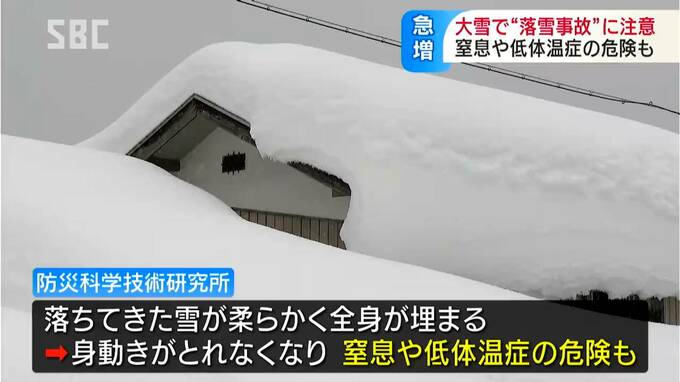 防災に関わる研究を行う防災科学技術研究所によりますと、落ちてきた雪が柔らかくても全身が埋まってしまうと身動きがとれなくなり、窒息や低体温症の危険もあるということです。