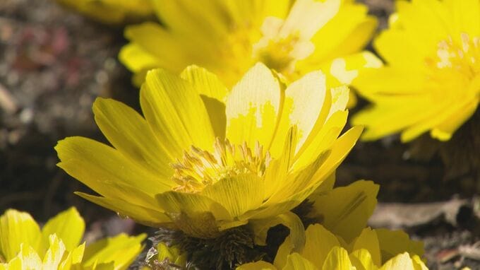 長野県豊丘村で、フクジュソウが見頃を迎えています。