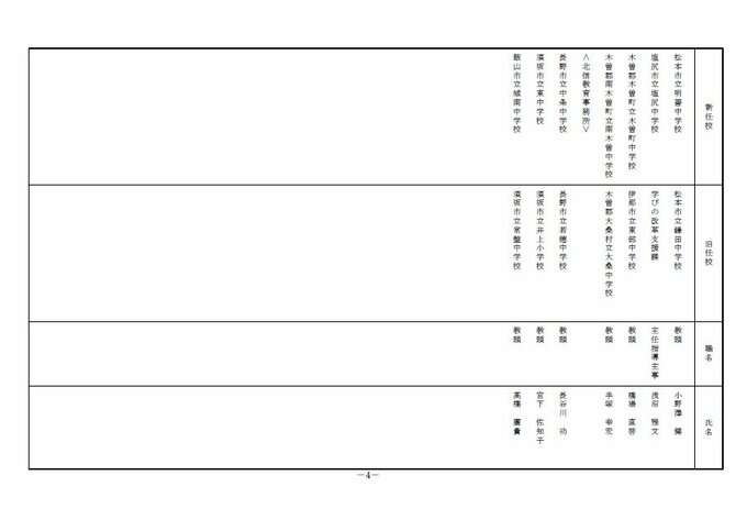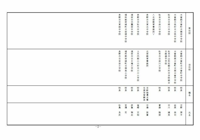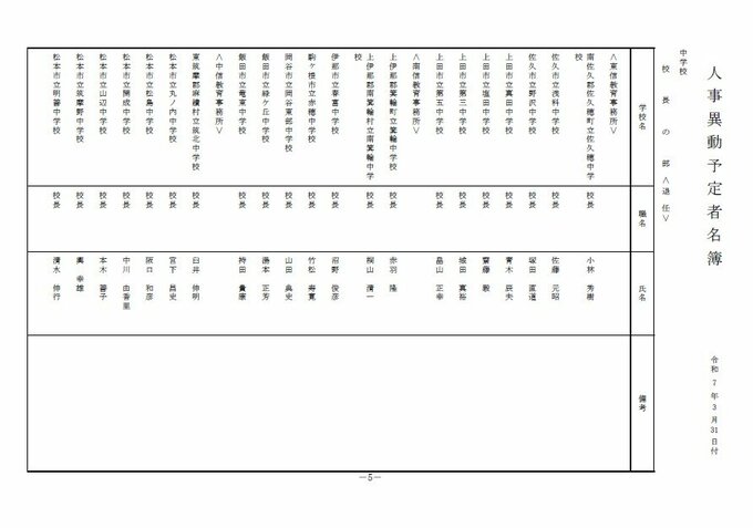 【小中学校の校長教頭など634人の全氏名掲載】女性29人が校長に 教頭は28人【長野県教職員人事異動2025】総数は3321人「あの先生はどこへ?」 2025年3月24日(月) 15:55 国内 □中学校校長 転任 □中学校校長 新任 □中学校校長 退任