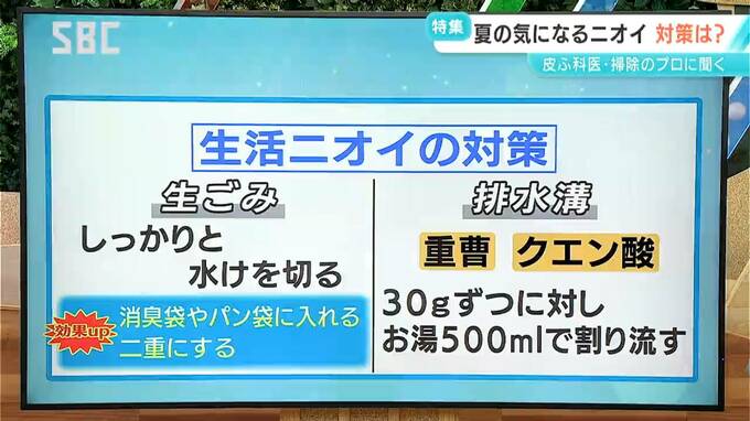 ニュースワイド特集 夏の気になる「ニオイ」 汗のニオイは小まめに…がポイント 市販の制汗剤は成分に注目!生ごみのニオイ対策 「食パンの袋」が役に立つ!? 2025年7月27日(日) 08:00 国内 ニオイ対策をおさらいします。