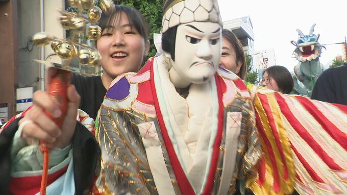 沿道には多くの見物客が集まり子どもたちも人形や出演者とのふれあいを楽しみました。