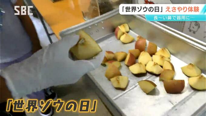 「世界ゾウの日」にあわせて、企画されたえさやり体験。人の手のひらサイズに切った大好物のリンゴを、与えます。