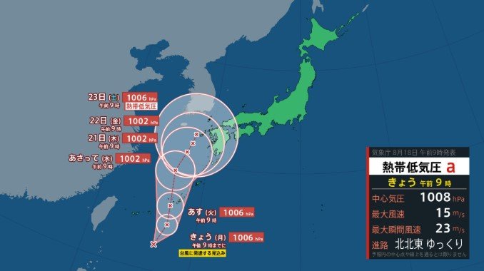 熱帯低気圧は今後12時間以内に台風となる見込みで、その中心は、18日午後9時には那覇市の南約240キロへと達する見込みです。中心の気圧は1006ヘクトパスカル、中心付近の最大風速は18メートル、最大瞬間風速は25メートルが予想されます。