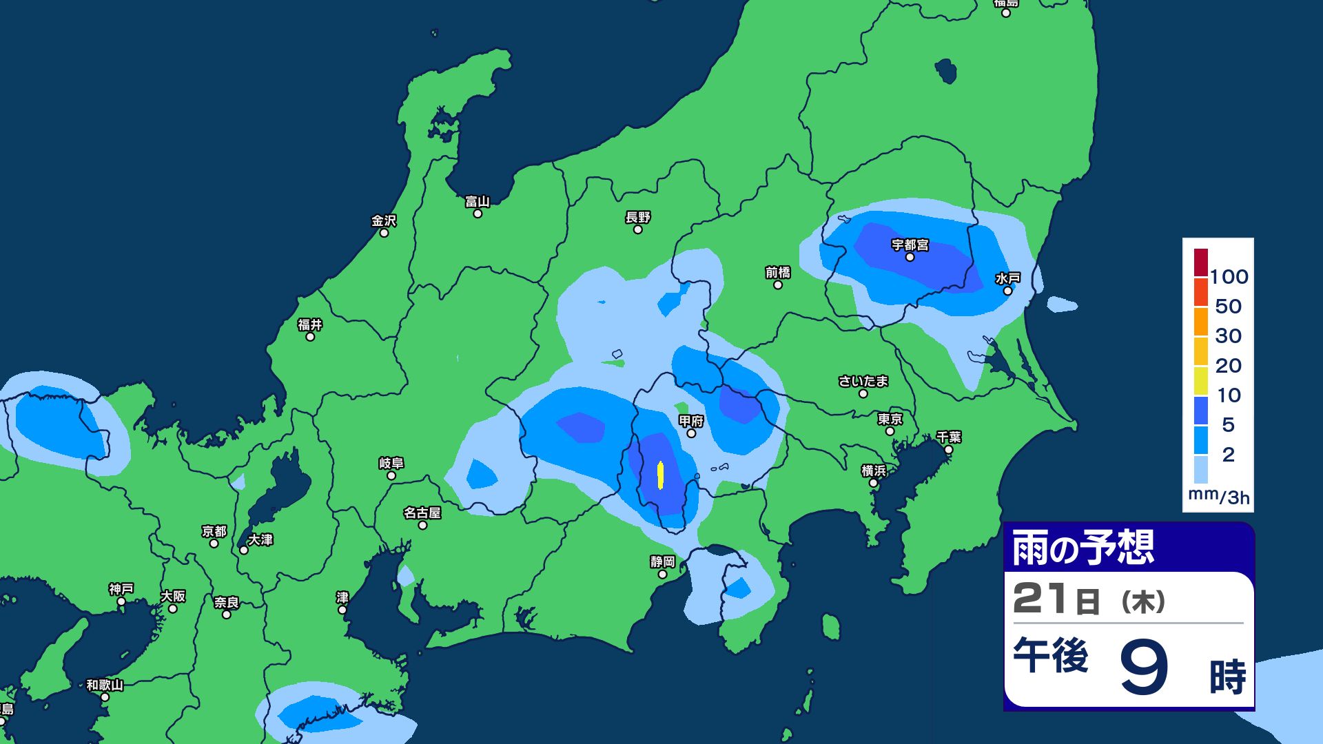 関東甲信地方では、21日夜遅くにかけて、雷を伴った激しい雨や