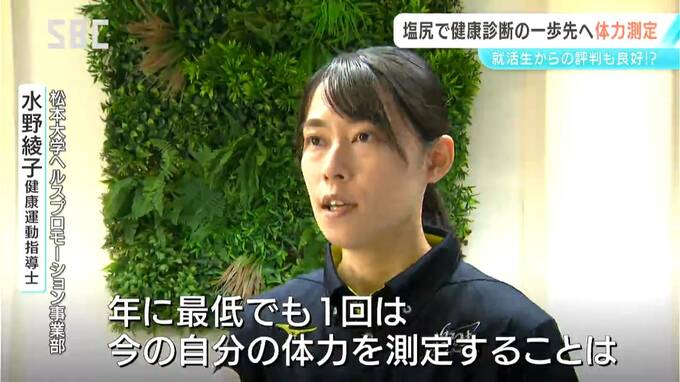 松本大学ヘルスプロモーション事業部 水野綾子健康運動指導士:「年々体力が減っていっているにも関わらず、最後に体力測定をした時(学生時代の)まま意識が止まってしまっているので、年に最低でも1回は今の自分の体力を測定してもらうことは意義のあることだと思います」