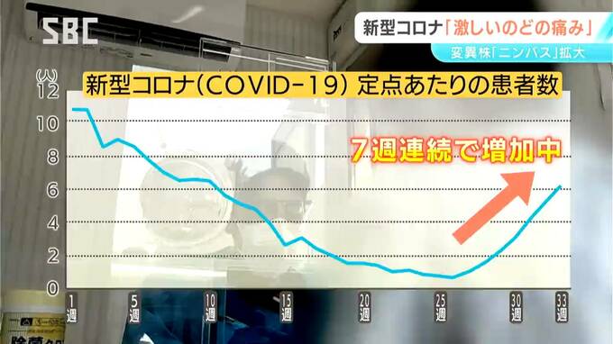 県内でも感染者数の増加傾向が続いています。中でも、強いのどの痛みを訴える患者が多いといい、新たな変異株「ニンバス」が拡大しているとみられます。