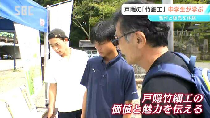 生徒は:「戸隠の竹細工を知らずに来ているお客さんが多かったが、お客さんにしっかり竹細工のことや戸隠のことを伝えてから、中学生が作ったんだよと伝えました」