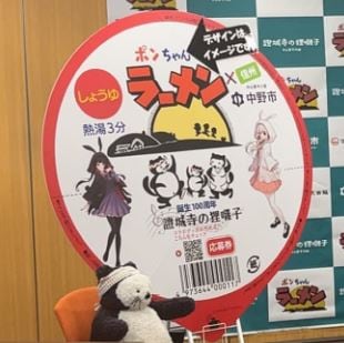 中野市は2日、長野市の食品会社、信陽食品とコラボして製品化したカップ麺「ポンちゃんラーメン」の限定パッケージの発売を記念したキャンペーンを始めたと発表しました。