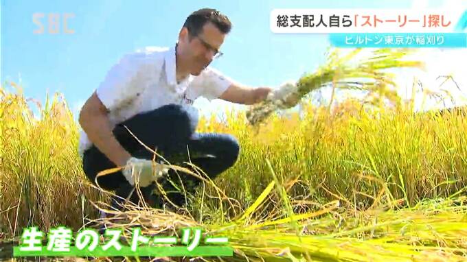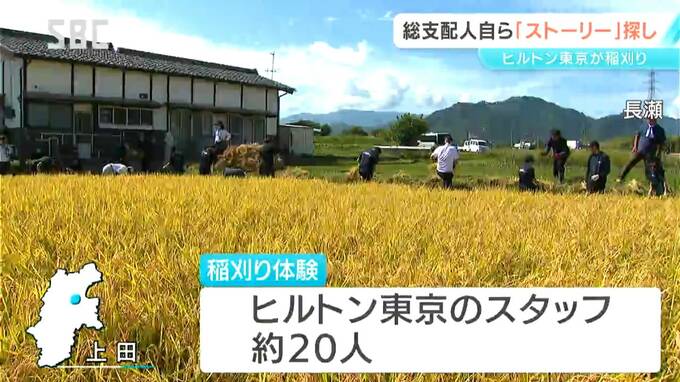 上田市の水田を訪れ稲刈りを体験したのは、ホテルのヒルトン東京から来た総支配人や料理長などスタッフおよそ20人。