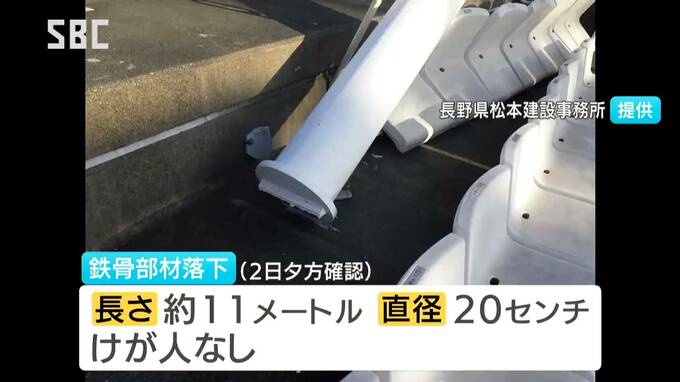 松本市の総合球技場サンプロアルウィンで2日、照明を支える長さおよそ11メートル、直径20センチの鉄骨部材が落下しているのが見つかりました。
