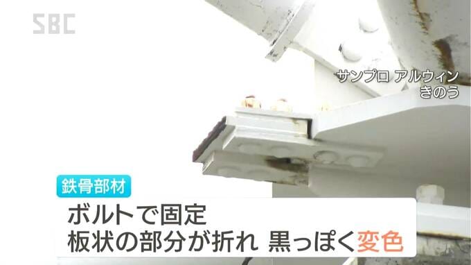 鉄骨部材はボルトで固定されていますが、現場を取材したところ、支柱とつないでいる板状の部分が折れていて、断面が黒っぽく変色していることが確認できました。