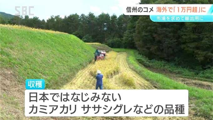 新米のシーズンを迎える中、アジアやアメリカに輸出するコメの収穫が伊那市で進んでいます。販売価格は5キロ1万円を超えるといいます。