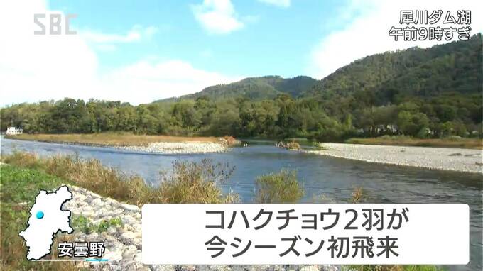 安曇野市豊科の犀川ダム湖には、10日午前6時ごろ、成鳥のつがいとみられるコハクチョウ2羽が、今シーズン初めて飛来しました。