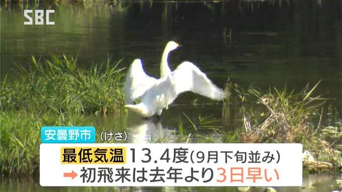 けさの安曇野市の最低気温は13.4度。9月下旬並みの暖かさでしたが、初飛来は去年より3日早くなりました。