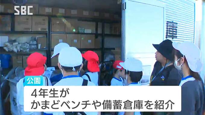 公園では年度を通じて防災学習に取り組んでいる4年生が、かまどとして使えるベンチや、備蓄倉庫などについて紹介しました。
