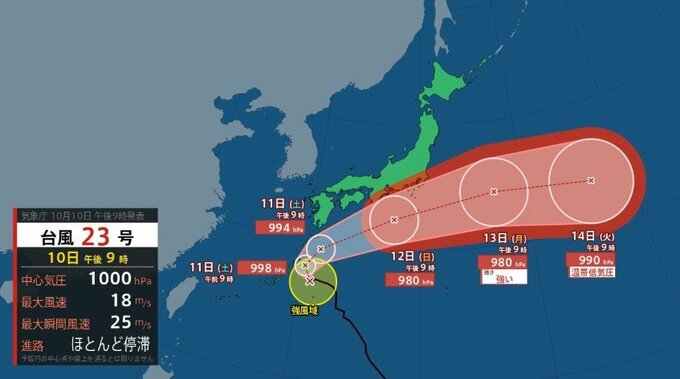 気象庁によりますと、台風23号は、10日午後9時には、南大東島の北北西約140キロにあって、ほとんど停滞しています。中心の気圧は1000ヘクトパスカル、中心付近の最大風速は18メートル、最大瞬間風速は25メートルで中心の東側220キロ以内と西側165キロ以内では風速15メートル以上の強い風が吹いています。