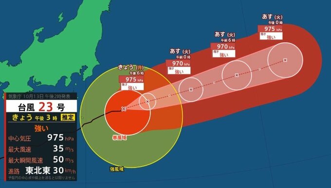 気象庁によりますと、強い台風23号は、13日午後2時には、八丈島の東約210キロを1時間におよそ30キロの速さで東北東へ進んでいます。