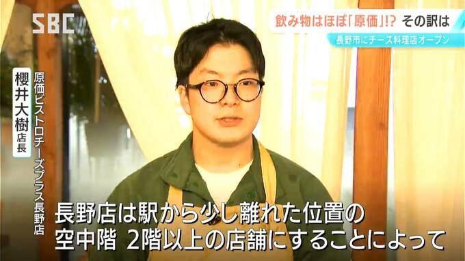 原価ビストロチーズプラス長野店店長 櫻井大樹さん:「長野店は駅から少し離れた位置の空中階、2階以上の店舗にすることによって家賃を大幅に下げて、原価でお酒を提供することが実現しております」