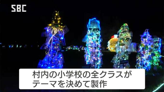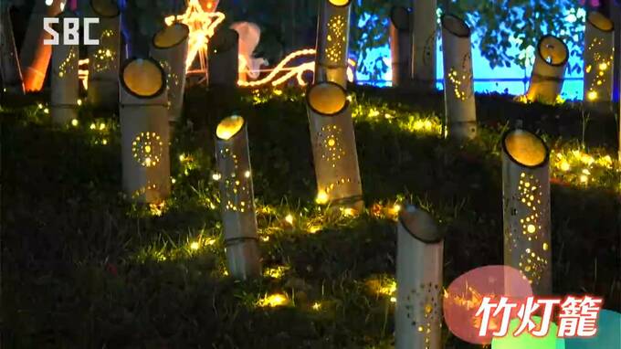 村内の小学校の児童がそれぞれのクラスでテーマを決めて作った作品が並べられたほか、飾り彫りを施した竹筒の中でLEDが光る竹灯籠が幻想的な雰囲気を感じさせます。
