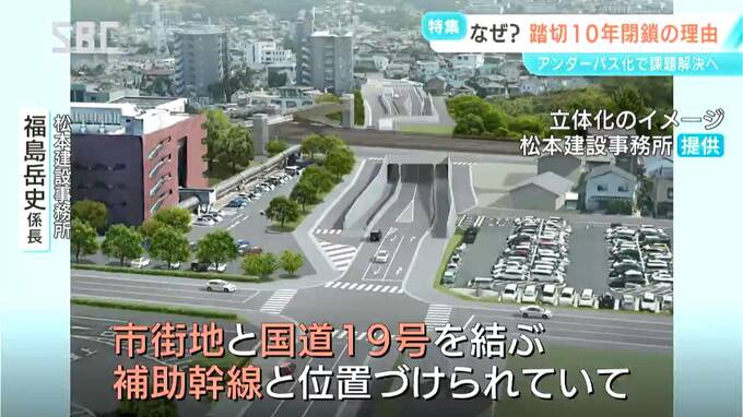 松本建設事務所 福島岳史係長:「上の方が西側で、国道19号の側から見ているイメージです。下が反対側から見ているような形になるんですが、今ある線路の下を道路がくぐることになります。市街地と19号を結ぶ補助幹線ということで位置づけられておりまして、そのために、円滑な交通の確保、それから安全確保が必要だということで」