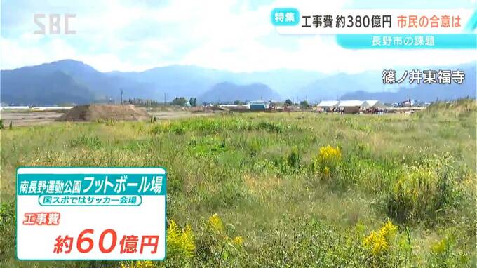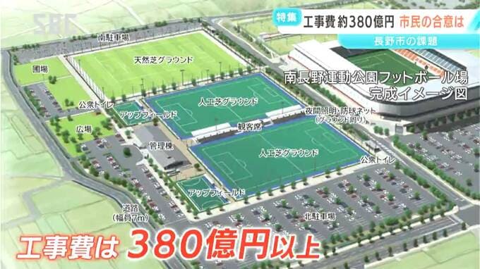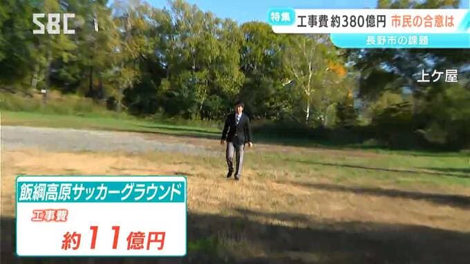 宮入キャスターリポート:「長野Uスタジアムの東側で進められる3面のフットボール場の建設におよそ60億円。さらに飯綱高原スキー場の跡地に2面のサッカーグラウンドをおよそ11億円をかけて作ります。これはJリーグの合宿の誘致などを見据えたものです」