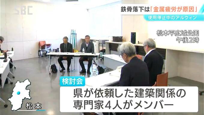 照明設備の鉄骨部材の落下により使用を停止している松本市の「サンプロアルウィン」について、復旧方法などを話し合う検討会が開かれました。