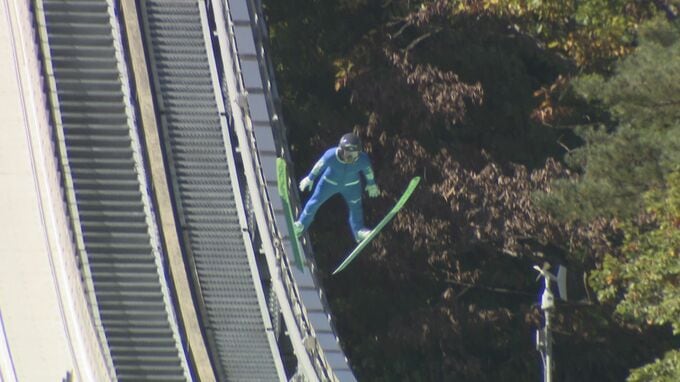 渡部暁斗選手は雲一つない青空の中、白馬ジャンプ競技場でラージヒルを3本飛びました。