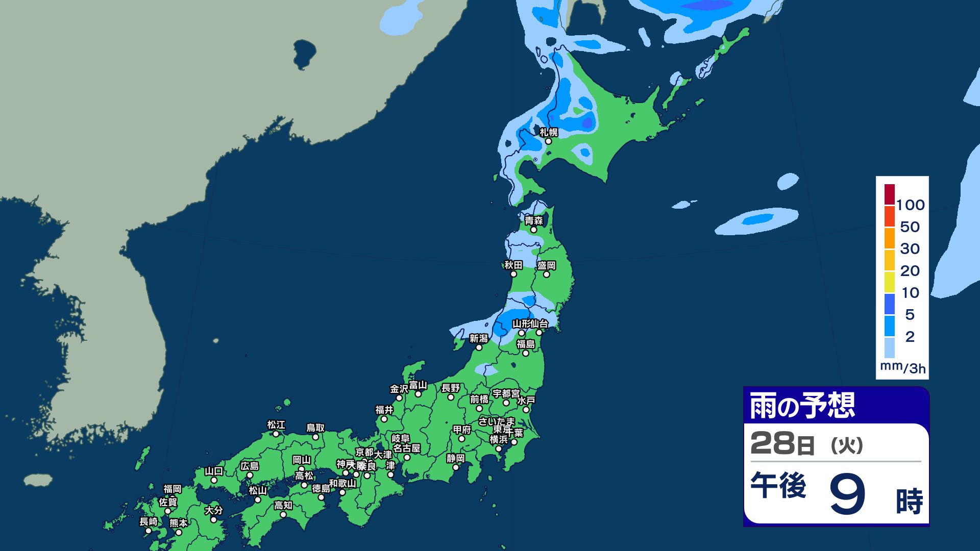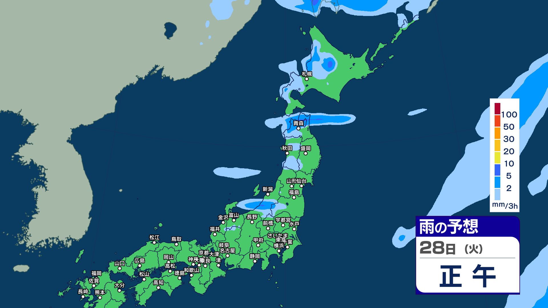 【気象情報】北日本と東日本 28日は落雷や竜巻などの激しい突風、降ひょうに注意 上空にこの時期としては強い寒気が流れ込む 気象庁 2025年10月28日(火) 11:51 国内 北日本と東日本では28日は、落雷や竜巻などの激しい突風、降ひょうに注意してください。 [気象概況] 北日本の上空約5500メートルには29日にかけて、氷点下30度以下、東日本では氷点下21度以下のこの時期としては強い寒気が流れ込むため、大気の状態が非常に不安定となるでしょう。 [防災事項] 北日本と東日本では28日は、落雷や竜巻などの激しい突風に注意してください。発達した積乱雲の近づく兆しがある場合には、建物内に移動するなど、安全確保に努めてください。また、降ひょうのおそれもありますので、農作物や農業施設の管理にも注意してください。
