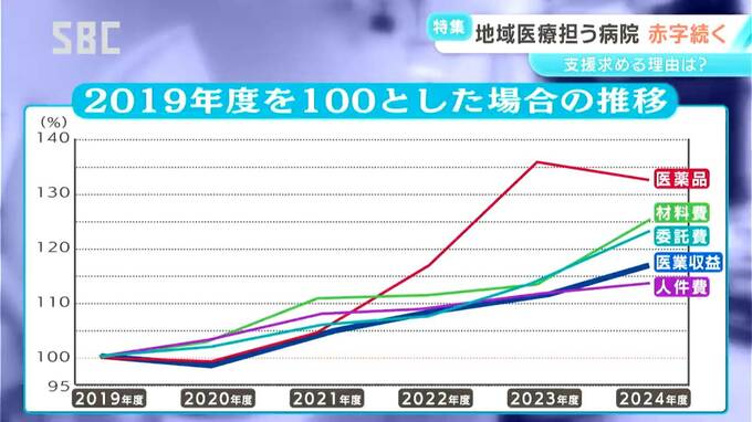 診療報酬は「公定価格」なので病院が勝手に上げられません。収入と支出を見ると、医業収益も増えていますが、医薬品や材料費の値上がり幅がさらに大きく、赤字体質は変わりません。