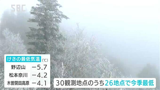 気象台によりますと、県内の最低気温は、南牧村野辺山で氷点下5.7度(全国3位)、松本市奈川で氷点下4.2度(全国7位)など30の観測地点のうち、26地点で今シーズン最も低くなりました。