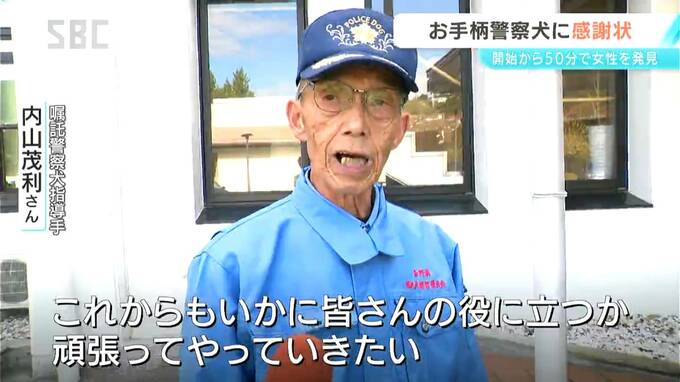 嘱託警察犬指導手 内山茂利さん:「犬がここにいると言ったら必ずその方向に向かうようにしたら正解に当たった。これからもいかに皆さんの役に立つか、頑張ってやっていきたい」
