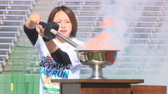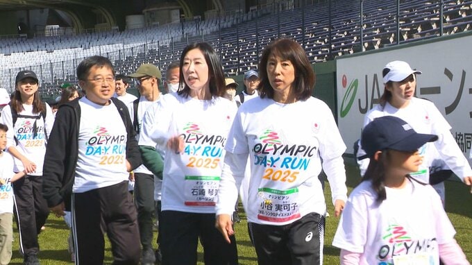 およそ500人の参加者たちはスピードスケートの加藤条治(かとう・じょうじ)さんやアーティスティックスイミングの小谷実可子(こたに・みかこ)さん、体操の村上茉愛(まい)さんなど12人のオリンピアンと一緒に南長野運動公園周辺のコースを走りました。