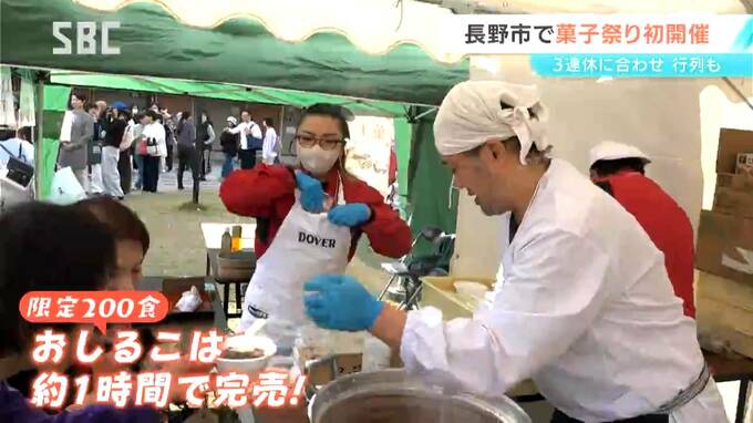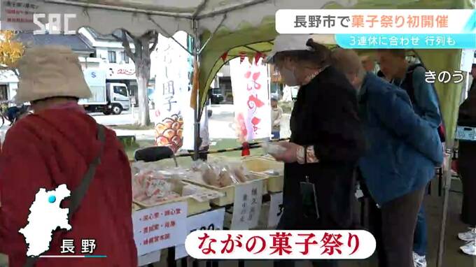 長野市のセントラルスクゥエアにできた、長~い行列。市内にある菓子店を知ってほしいと菓子組合が初めて企画した「ながの菓子祭り」です。