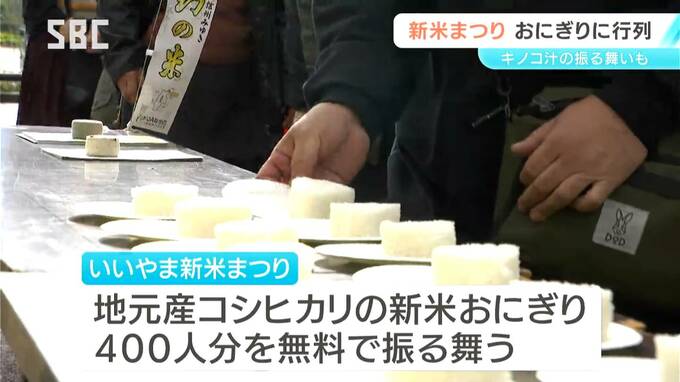 「いいやま新米まつり」は今年で3回目。この秋収穫された地元産のコシヒカリの新米おにぎり400人分が無料で振る舞われました。
