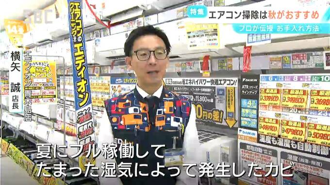 エディオン青木島店 横矢誠店長:「夏にフル稼働してたまった湿気によって発生したカビ、そのまま暖房稼働時に吹き出してくるようなことがある。ぜひこの秋にクリーニングをするのがおすすめ」