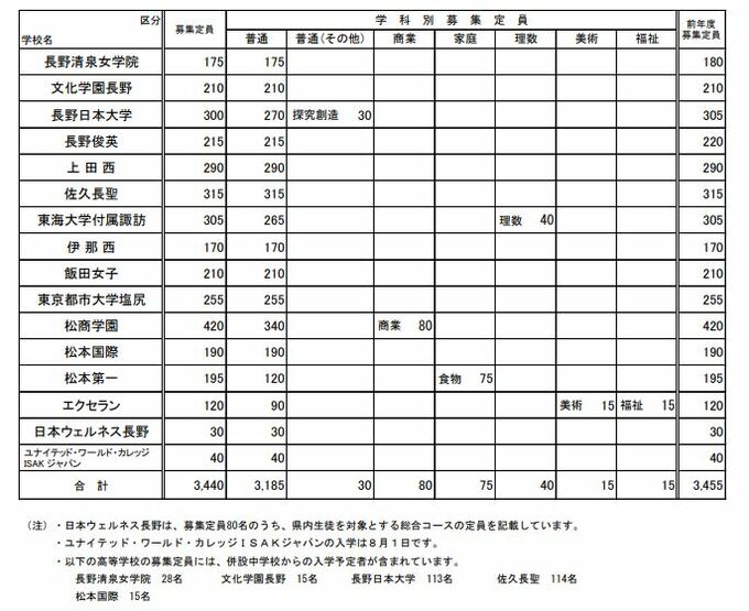 長野清泉女学院は180人から175人に、長野日本大学は305人から300人に、長野俊英は220人から215人に、それぞれ5人ずつ減ります。