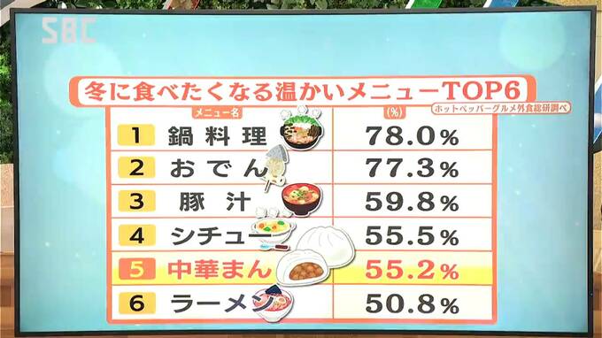 冬に食べたくなる温かいメニューランキングです。トップ3は、鍋料理、おでん、豚汁と並びますが、5位に中華まんが、ランクインしています。