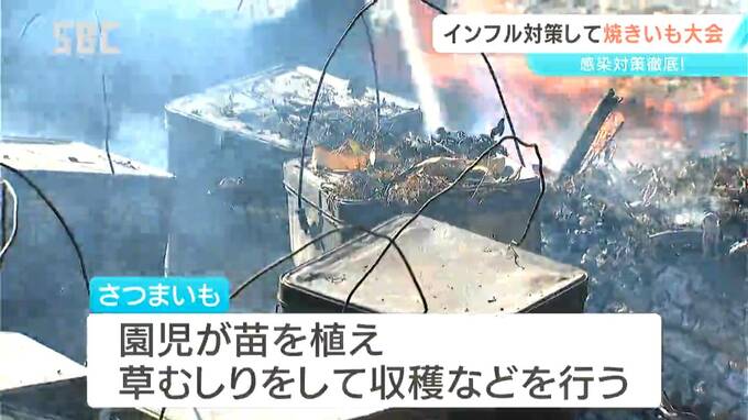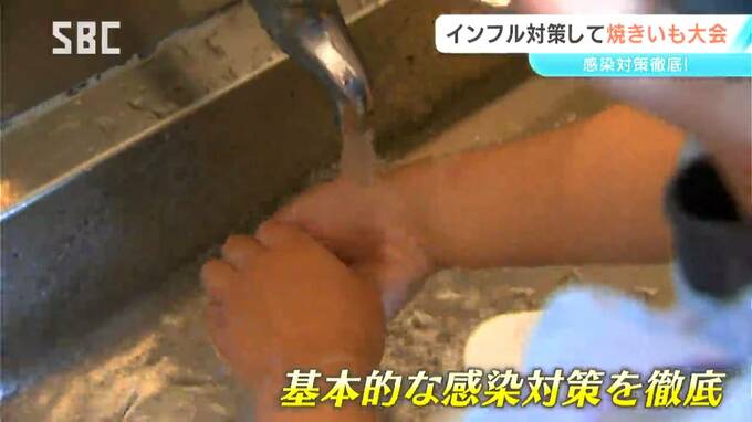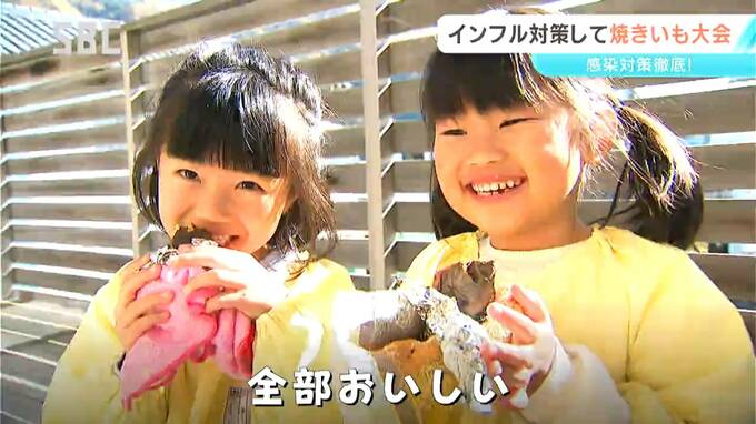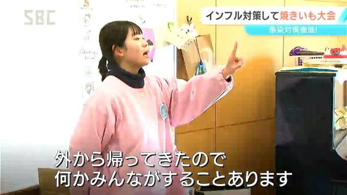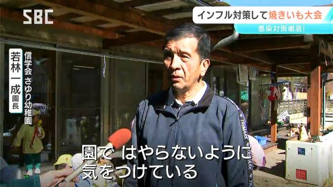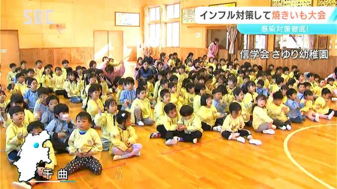 インフルエンザが流行する中、千曲市の幼稚園では、感染予防に配慮しながら焼き芋大会が行われました。