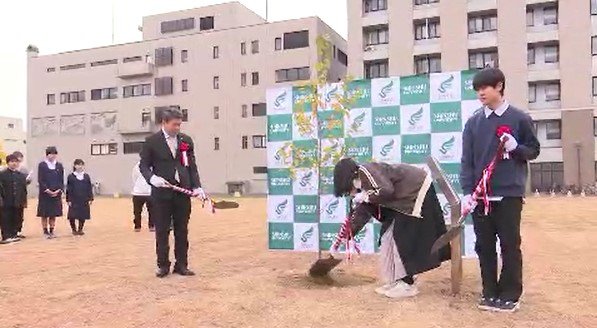 きょうは、中村宗一郎学長や学生の代表がカツラの木を植樹をして完成を祝いました。