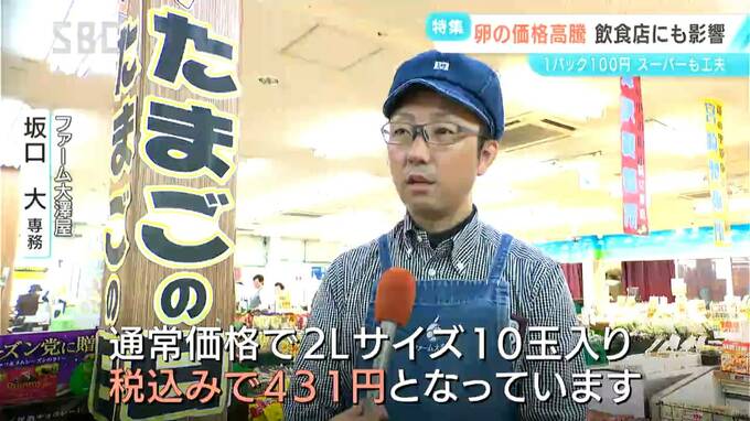ファーム大澤屋 坂口大専務:「通常価格ですと、当店はタマゴの2Lサイズ10玉入りで、税込みで431円となっています。去年も高かったんですけど、それでも税込みで323円。(ここまでの値上がりは)全く持って予想していません」