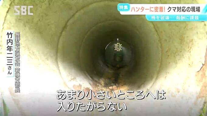 竹内年二三さん:「あまり小さいところへは入りたがらない。今まではクマもお仕置きをして放獣するのが基本だったからこういう(ドラム缶式の)もので。他県の状況を見ると格子のもので、クマを獲っている。長野県はそういう(格子の檻を使う)許可が出てこない。(導入の)検討をしていかないといけないのでは」