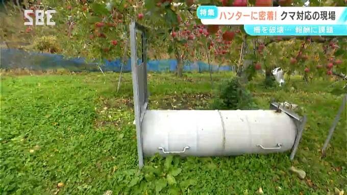 山際にあるリンゴ畑では、クマを捕獲するための檻を仕掛けています。