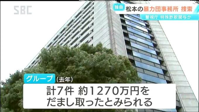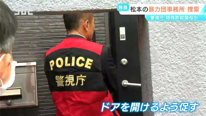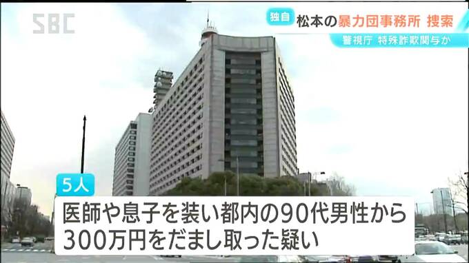 高齢の男性から現金をだまし取ったとして県内の暴力団幹部などが逮捕された事件で、警視庁は松本市内の事務所を家宅捜索しました。