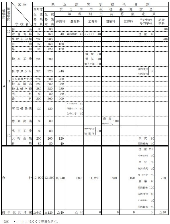 【全校一覧掲載】2026年春の公立高校の募集定員 全日制1万2960人 多部制440人 定時制680人 長野県