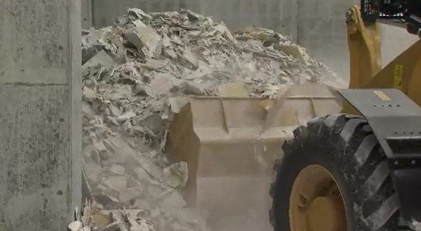 重機を使って機械に投入されていくのは、使用済みの「石こうボード」。建物の天井や壁の下地材として広く使われています。