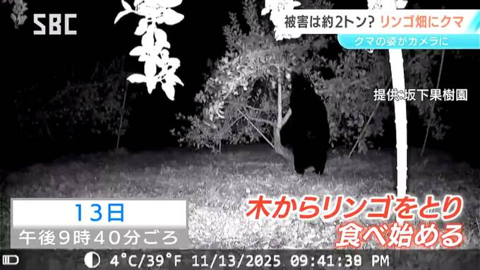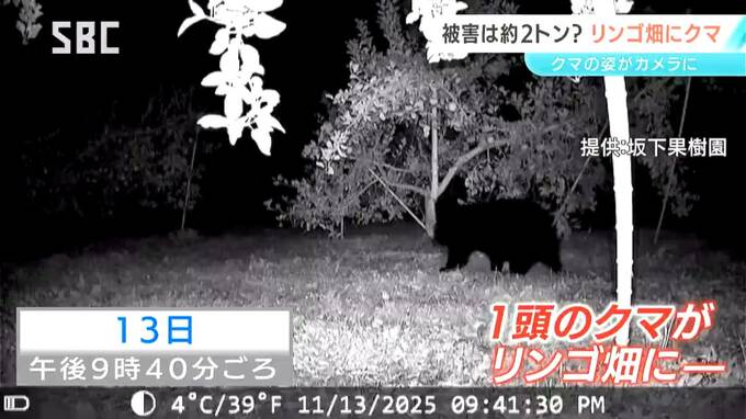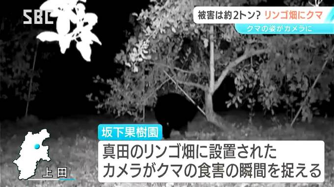 上田市の果樹園で収穫前のリンゴがクマに食い荒らされていたことが分かりました。まるまると太ったクマの姿を監視カメラが捉えていました。