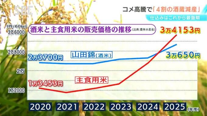 農水省によりますと、代表的な酒米=山田錦は、主食用のコメより60キロ当たり1万円近く高値で取引されてきましたが、2025年度産はさらに25%近く上昇しました。